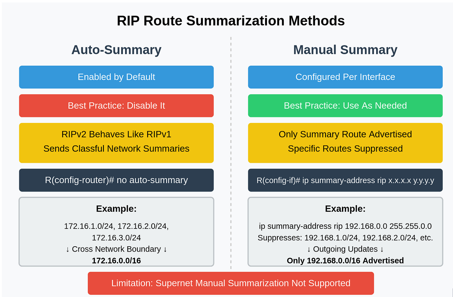 Route summarization in RIP can be performed in two ways: auto-summary and manual summary. Both methods help reduce routing table size and minimize update traffic, but they work differently.